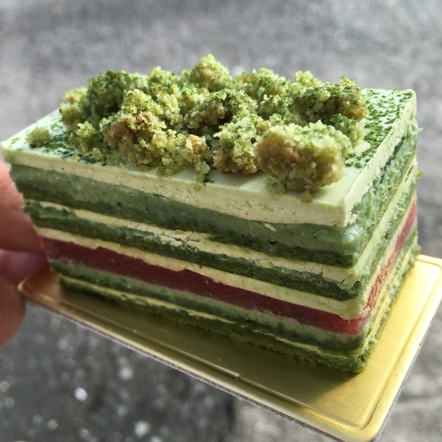 薄ーい抹茶チョコだのクリームだのスポンジだのを幾重にも重ねて、カラメルコートでザクザクなクラッシュナッツをパラッと