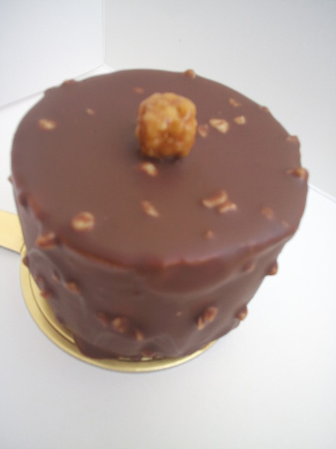 さっくりのパイ生地?ベースの上にヘーゼルナッツとチョコのムースをのっけて、ミルクチョコでコーティング