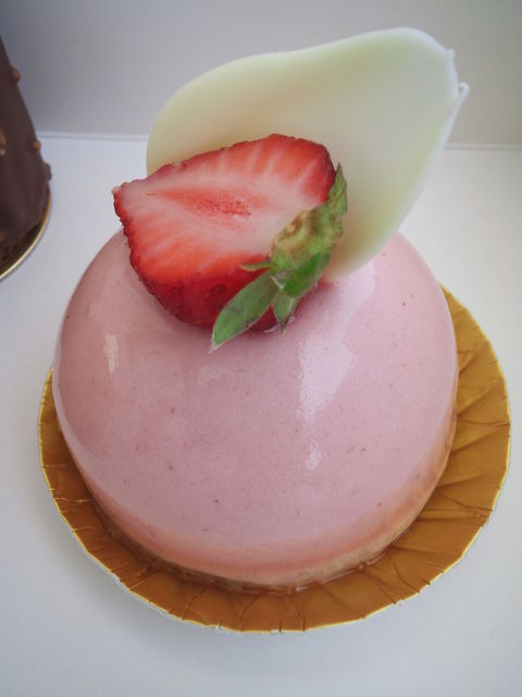 かわいいイチゴミルクのジェルドームの中にイチゴミルクのムースとイチゴのソースとピスタチオのムースを仕込み
