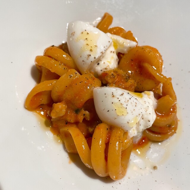 絶妙な茹で加減のため、程よい弾力とネジネジに絡みつくトマトソースとリコッタチーズの旨みが爆発。