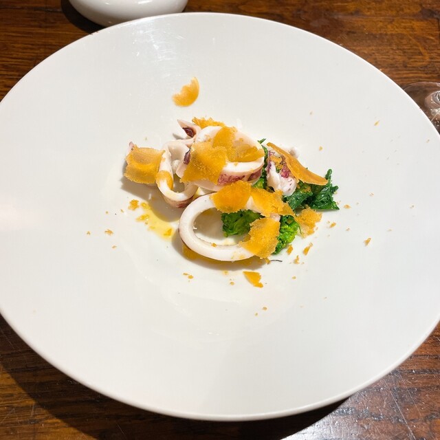 イカの甘さとカリフローレの甘さ、カラスミの塩味が合います。