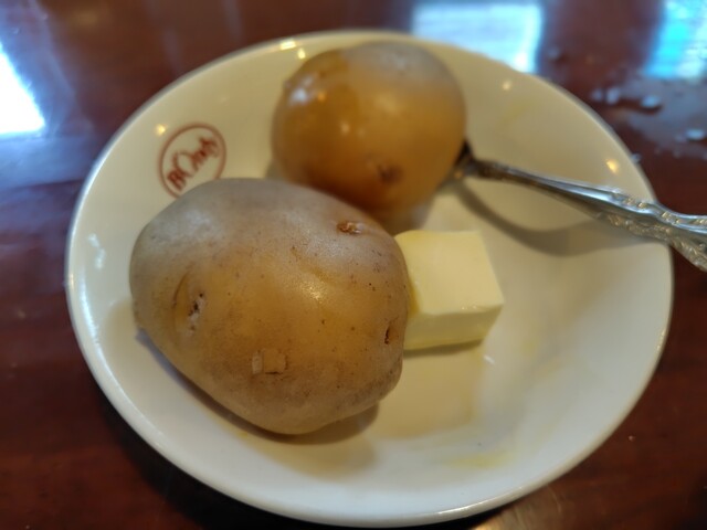 すぐに名物のじゃがいもが出てきて、熱々のうちにバターを載せてカレーを待つのですが、やっぱりホクホクを食べたいのでカレーが出てくる前にお皿は空っぽ。
