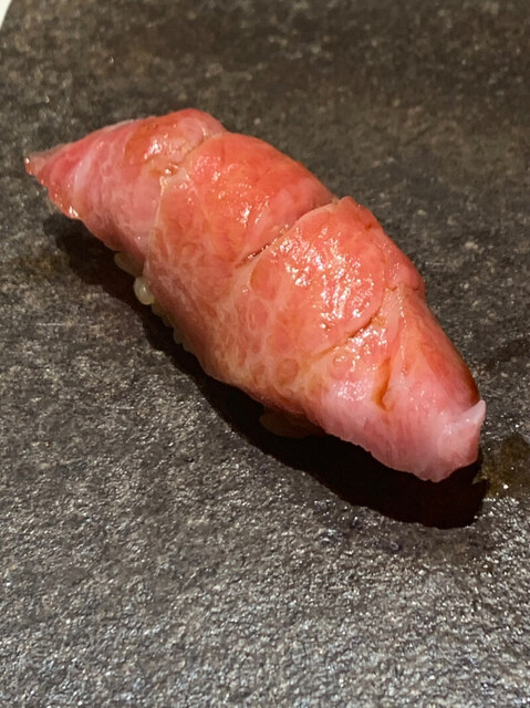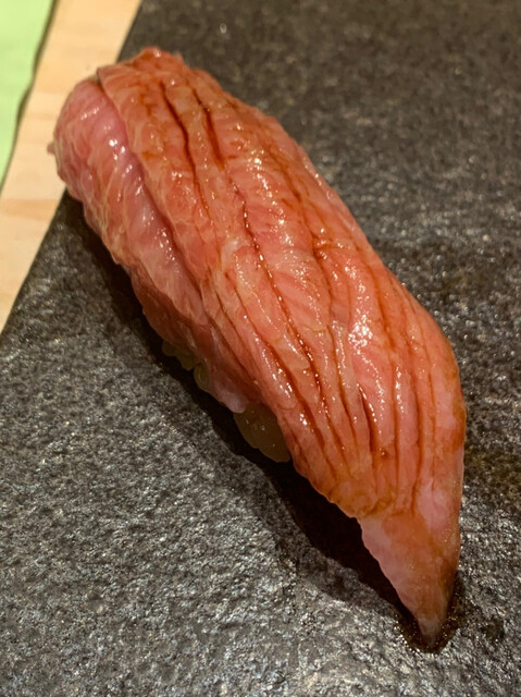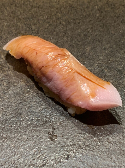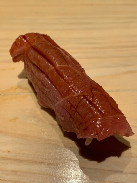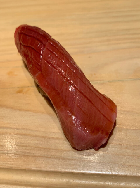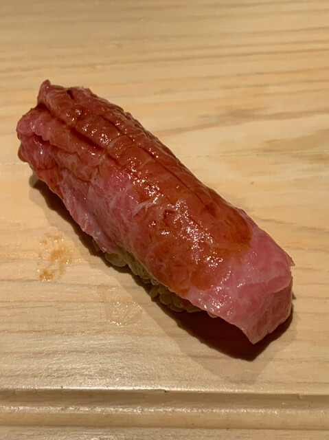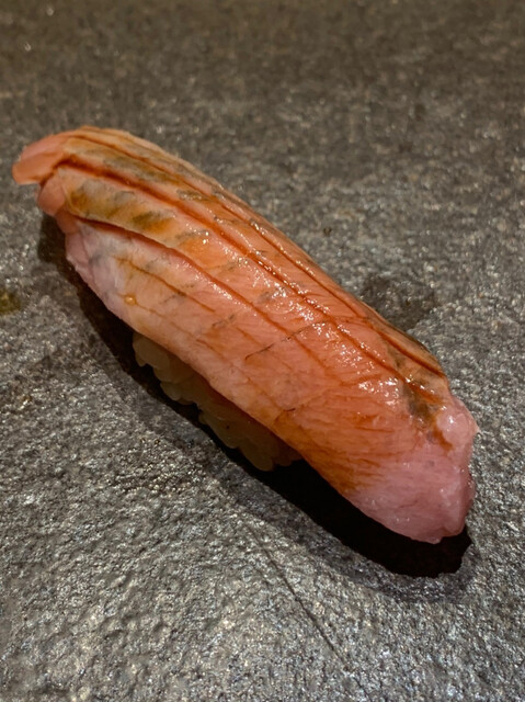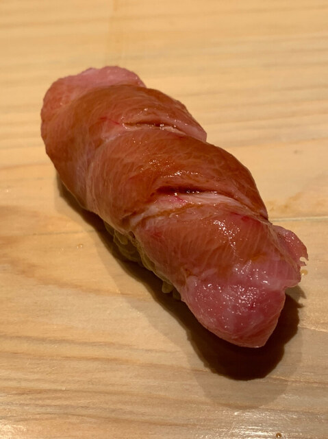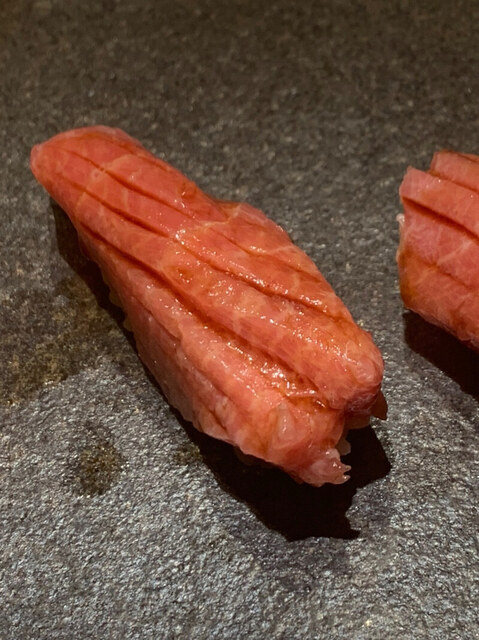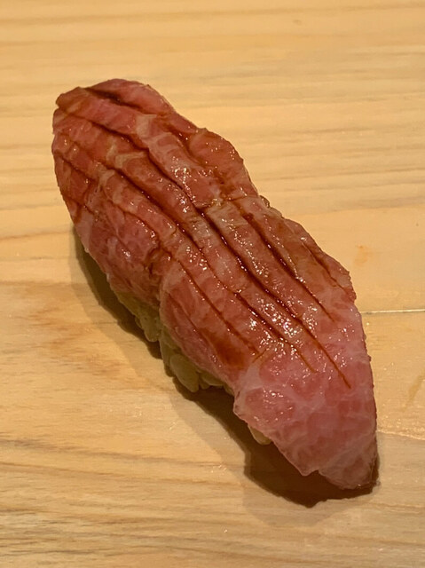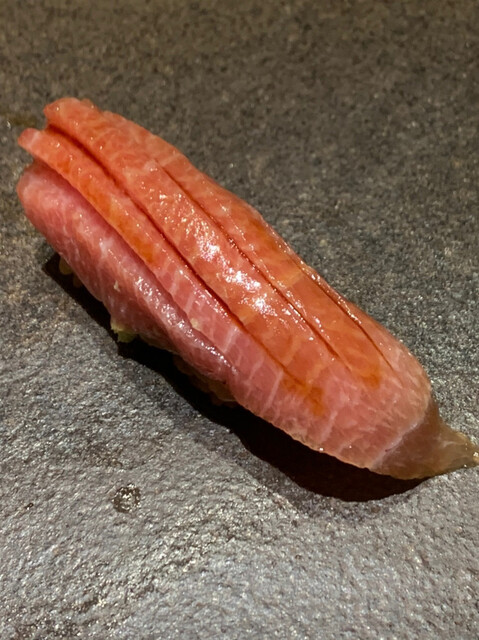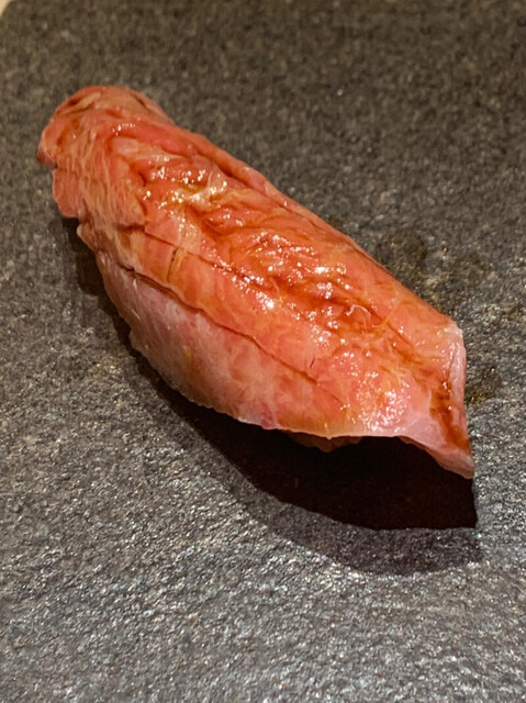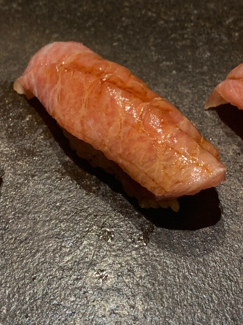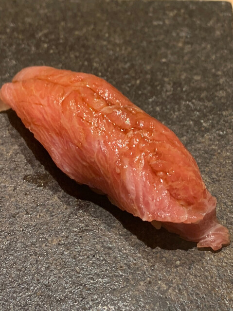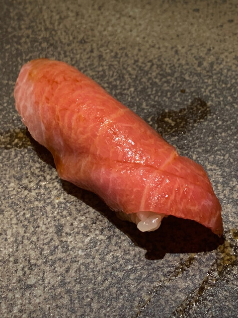 大船渡霜降り。この日の至高の1貫。シャリは大間レッドで握られていた。