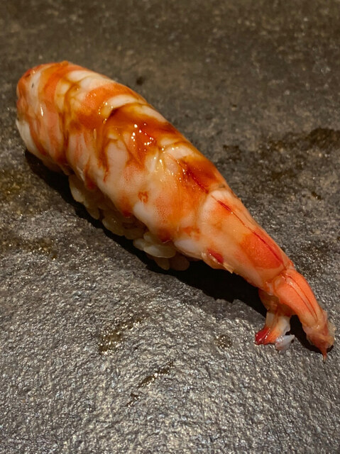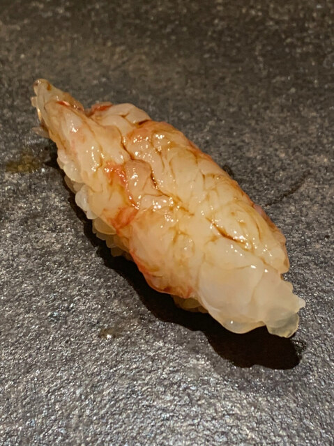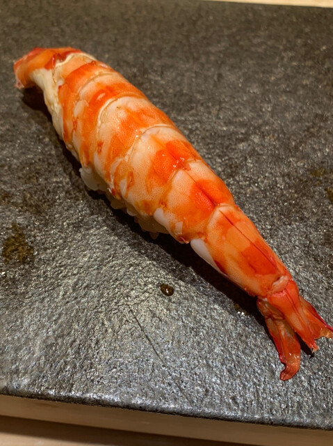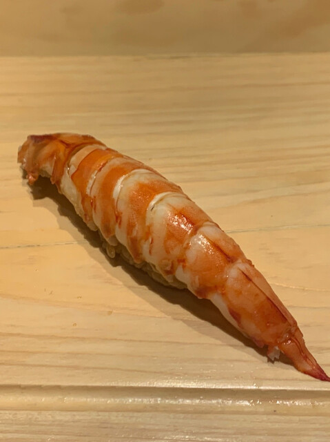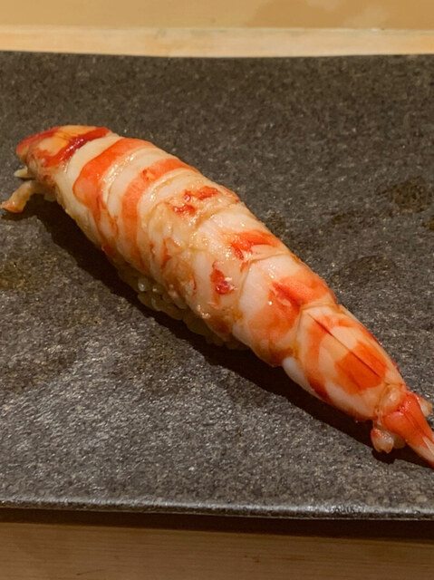ここからシャリは赤。天然の車エビ。ボイルしたてで肉厚で美味い。エビの朧をかましてある。