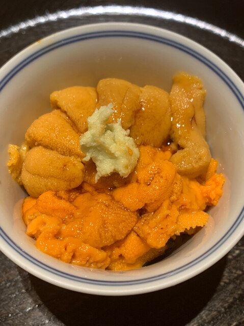 蝦夷バフンウニの2階建て違法建築。違法なので私の分のウニが総崩れで作り直したもの。ウニそのものを先ず味わい、その後ウニの軍艦巻を食べる。