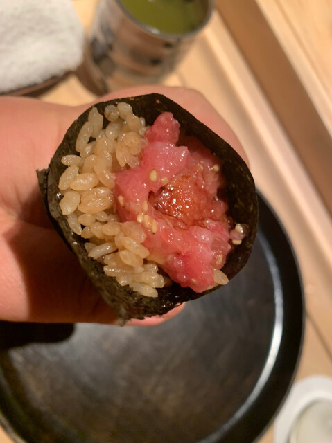 八丈島大トロ鉄火巻。しかしその脂は体にいいEPAだ。面積問題完全クリア。