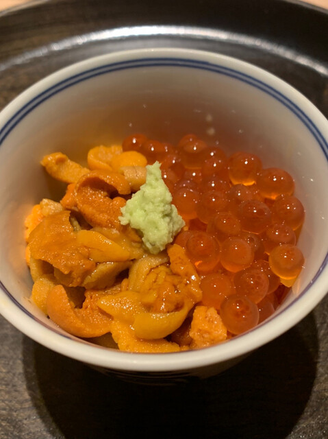 2階建て違法建築のウニ。先ずウニを食べ、次にウニの軍艦巻きを食べる。ちなみに軍艦巻きは銀座久兵衛の2代目の今田氏が始めたとされる。