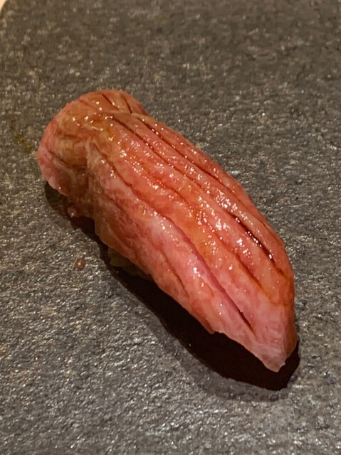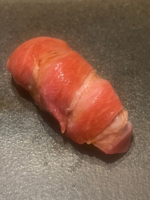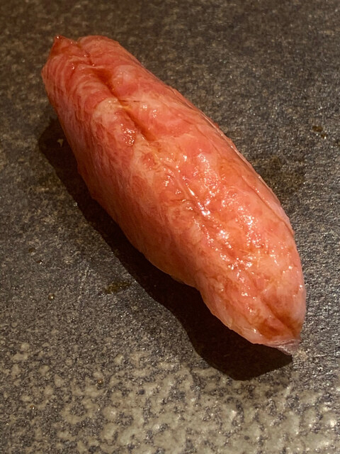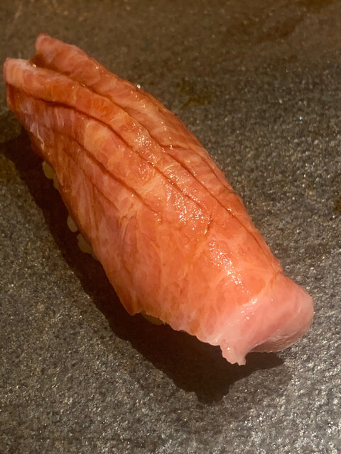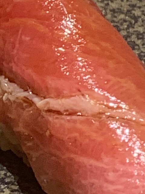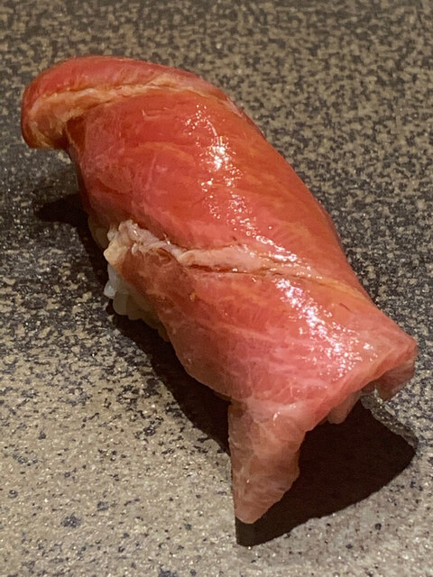 拡大図で見るときれいな大理石様文様が入っており、まさに究極のトロに近いと思うのだが、この時点でもシャリはロゼ。大将には赤シャリを使う程ではないと思っているのだろう。