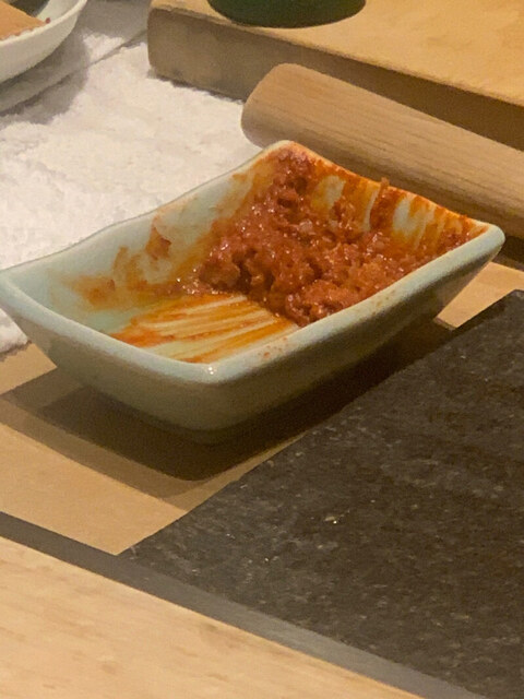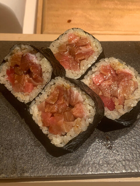 大間のマグロのつみれ汁。何という贅沢。イワシで十分だと思って飲むとやっぱりこれがいいと心の底から思う。これを作った彩姉は山ちゃんとともに歴代おおはたバックヤードの中で最も優れている。最近外観も寿司職人ぽくなってきた。
