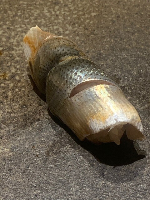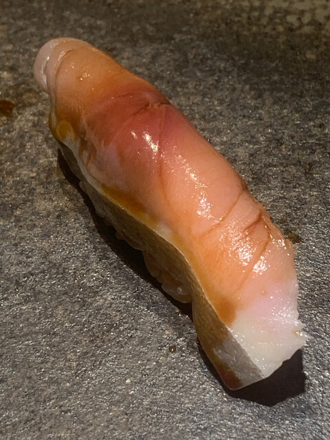 クルマエビ。握る直前に完全ボイルしてある。大将によると今流行の半生ボイルはエビの臭みが残り美味しくないとの由。なるほど言われてみればそうかもしれない。