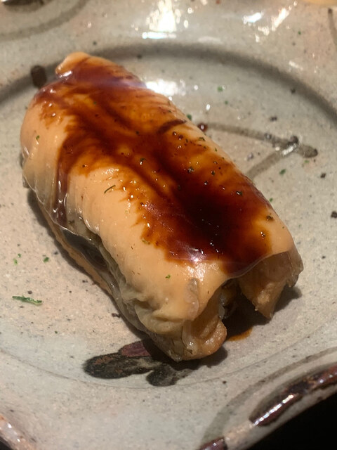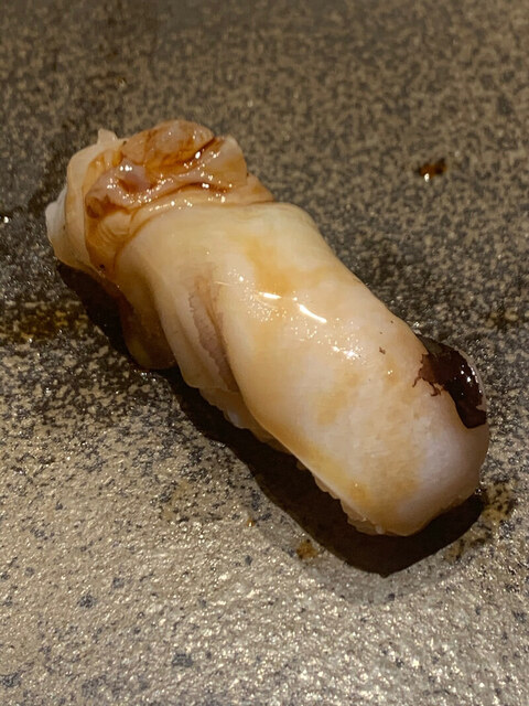 穴子。豊洲の寄りぬき。煮方は鶴八流でアナゴの煮汁で煮て、いったん煮汁に出た穴子のエキスを穴子に戻すという作り方。穴ツメを塗ってある。