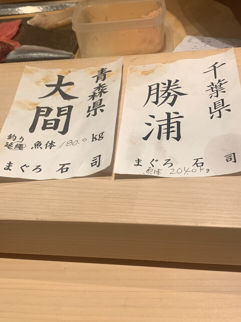 さてマグロである。先ず三厩の80kg6日熟成を前座で出し、次に大間188kg11日熟成を出しますと大将。私は大間に弱い。石司の大間と書いたこの紙を見ただけでパブロフの犬のようにヨダレが出てくるくらいだ。