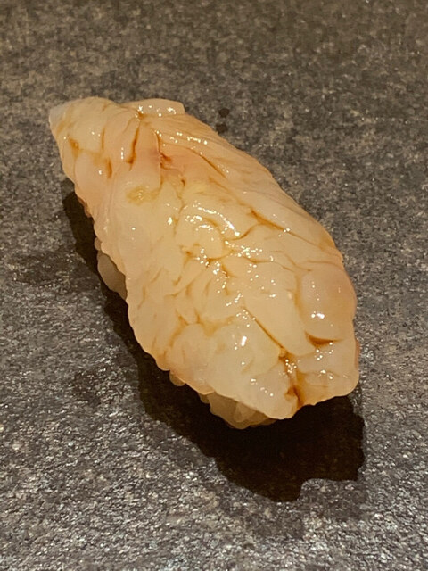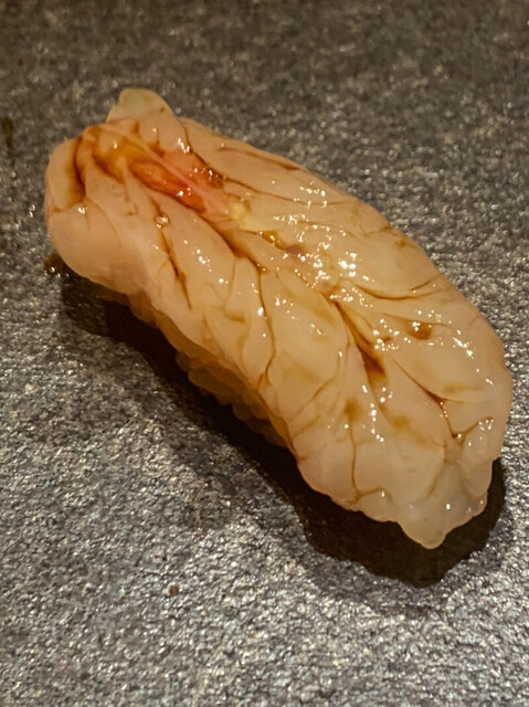 タラ白子の蒸し寿司。脳のような外観。濃厚な脂にワサビは香付けだ。