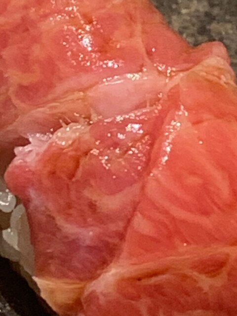 拡大図で見ると脂のアラインメントが三厩より整然としている。やっぱり大間はすごいのか、このマグロだけがそうなのかは不明だが究極を食べさせてもらったなあ。