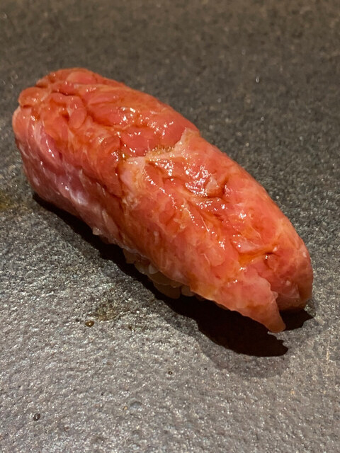 塩釜赤身。シャリはロゼ。酸味もあり美味しい。