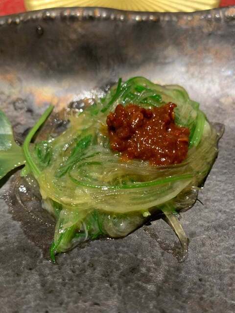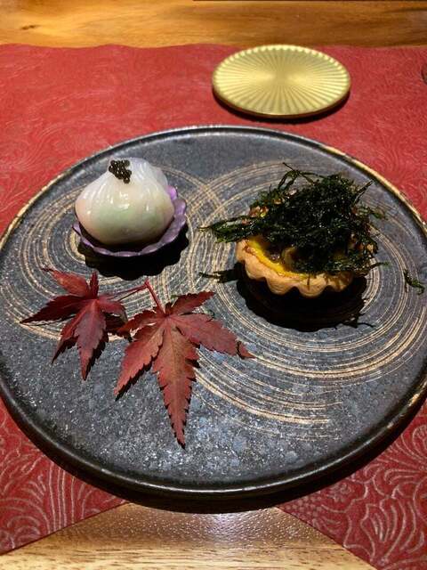 先付け。湯葉に包まれたサーモン、クラゲの頭載せ。いきなり複雑な味わいで美味い。