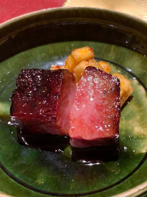 ラフランスには自家製ラー油がかかっており、甘さを少し抑制。肉の旨味とラフランスの甘みとラー油の辛さが口腔粘膜を刺激。たまらない美味しさ。
