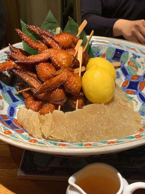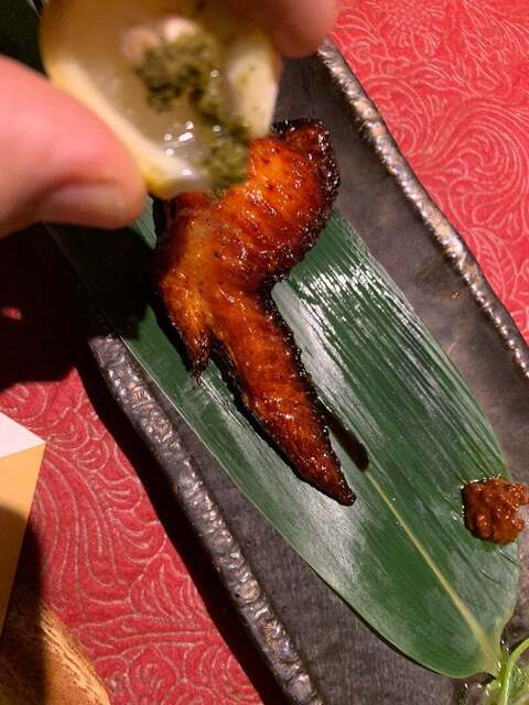 がぶりと食べると手羽の中に蟹身が。凝った演出。