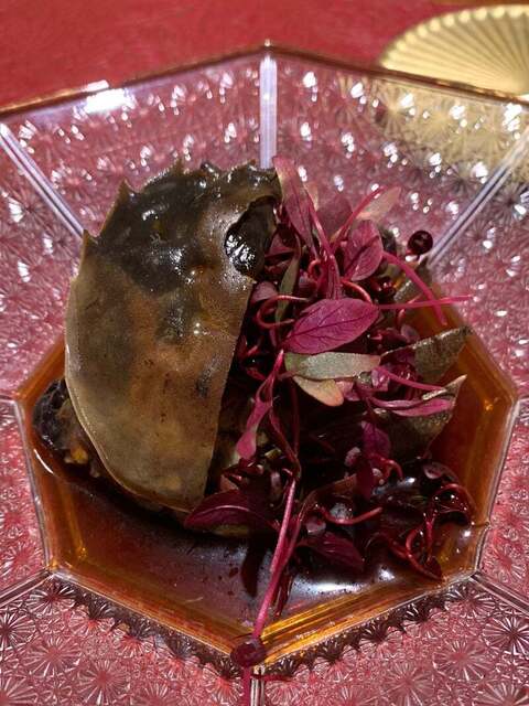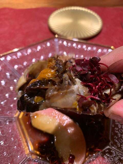 2か月半紹興酒のスープに漬けた上海蟹と焼きリンゴ。