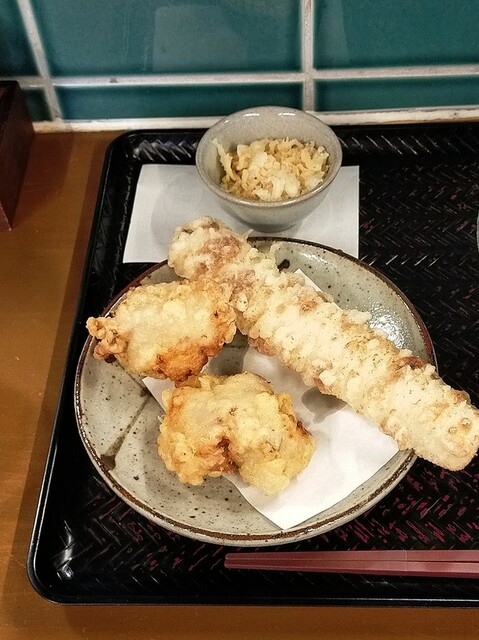 ひやひや(中・500円)+野菜天(4種300円)・巾着カレー天(150円)