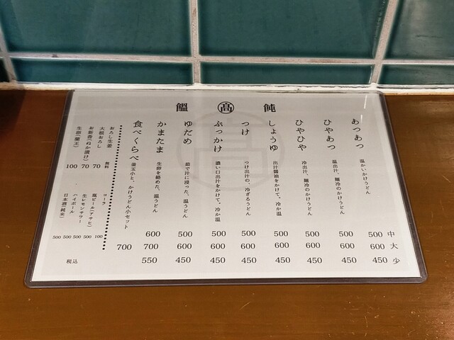 店内メニュー うどんのサイズは大・中・小から選択可