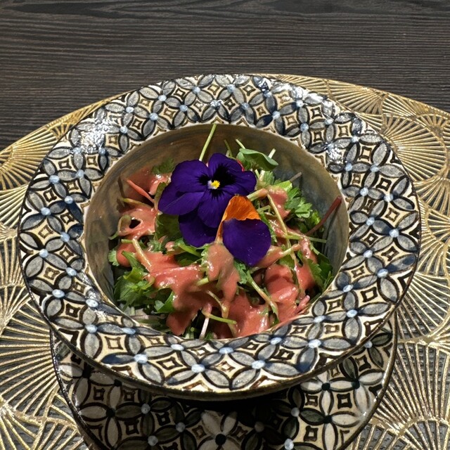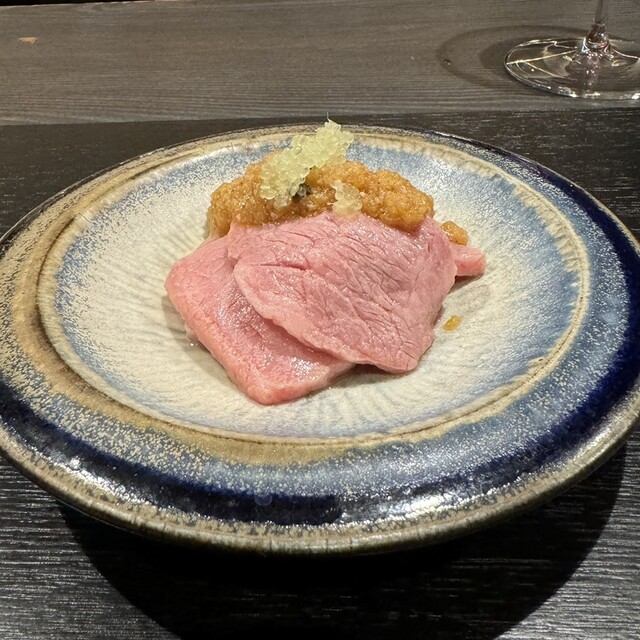 はらみ、トリュフ醤油、木の芽、ゴマ、パイナップル