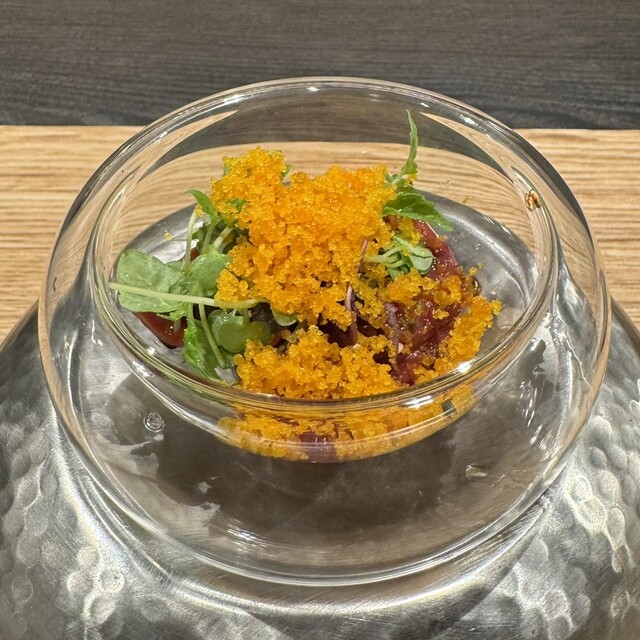 ハツのづけにミョウガ、シラス、イタリアのカラスミ ボッタルガ。