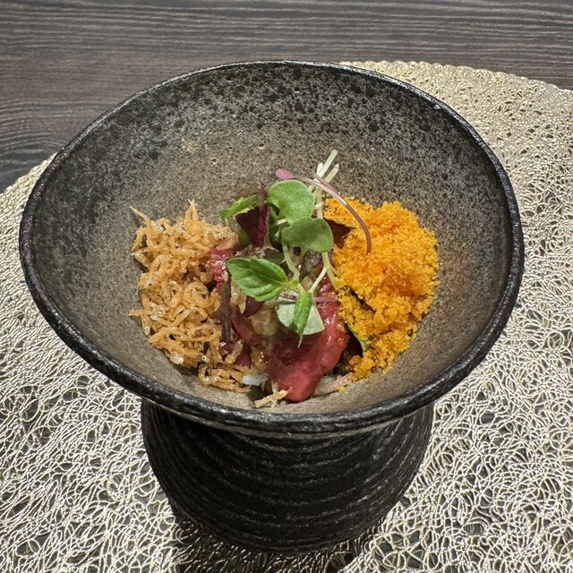 サーロイン、ヘレを刻んだもの、うなぎの赤ワイン煮込み、雲丹クリーム、桜エビ