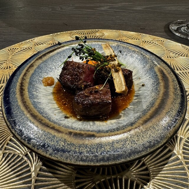 サーロイン、キャビア、新玉ねぎ、山わさび、ローズマリー、アスパラ