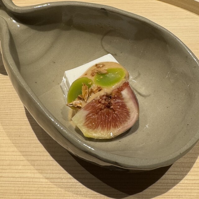 ⚫︎落花生豆腐 落花生を1時間ローストしたソース、インゲン、いちじく