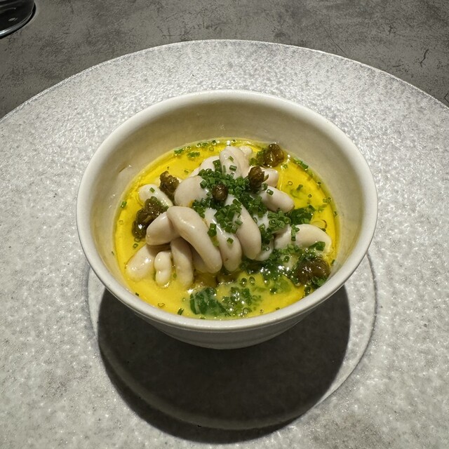 甘海老、揖保乃糸、穂紫蘇、カラスミ、冷製パスタ