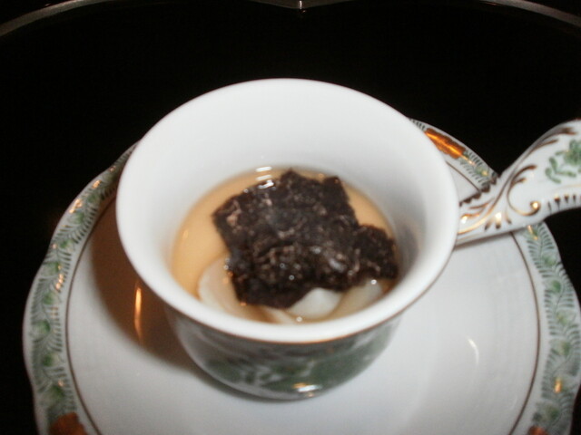 :私が初めてうかい亭で食べた鮑が此れだった。ある意味の原点だ。鮑は数年前にK総料理長が東北を歩き回 って探し当てた青森・三戸の物。