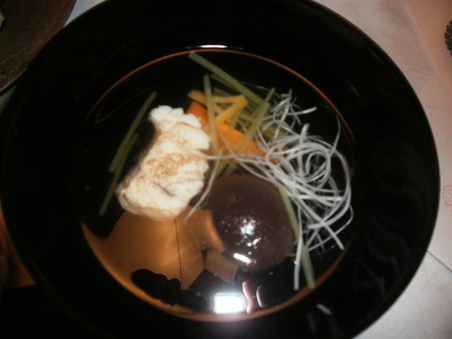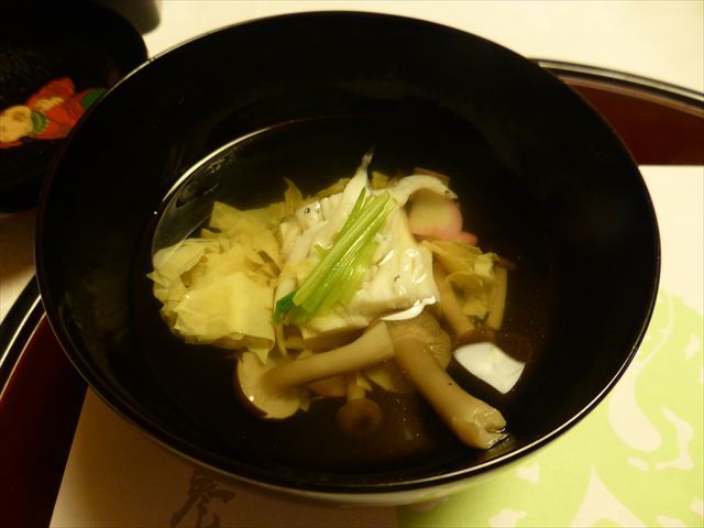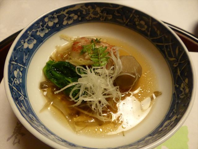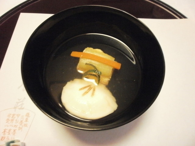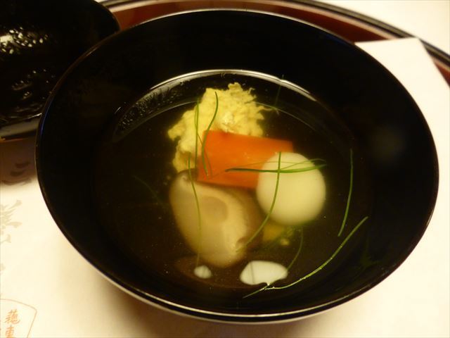□△ お椀 鮎魚女葛打ち、椎茸・人参・蓬麩・蓮芋・柚子