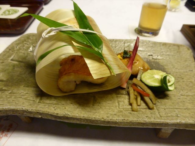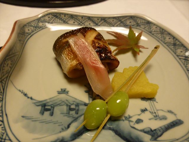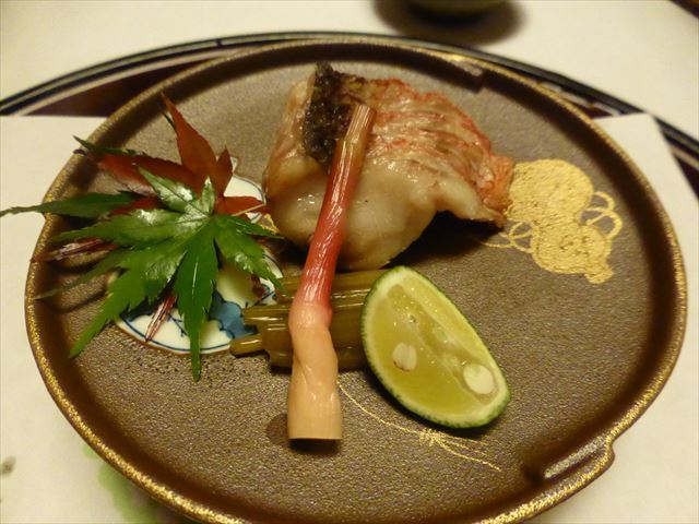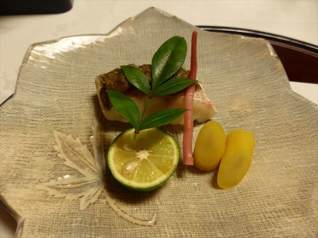 △□ 焼物 柳鰈酒焼き、骨煎餅添え、丸十蜜煮、初神生姜、豊作稲穂