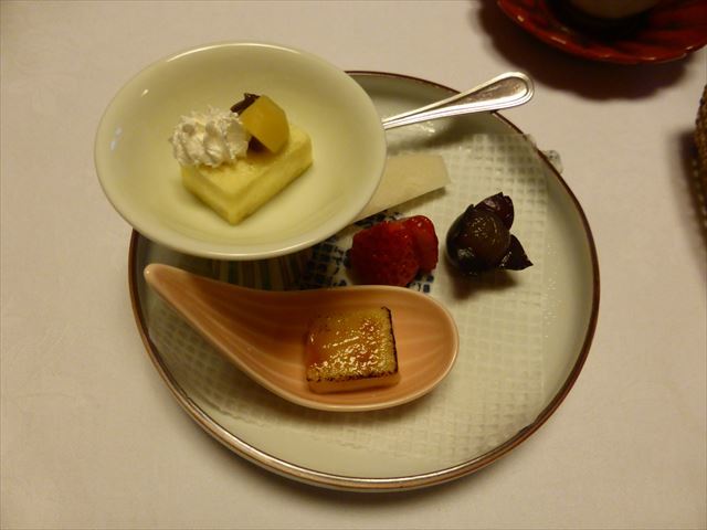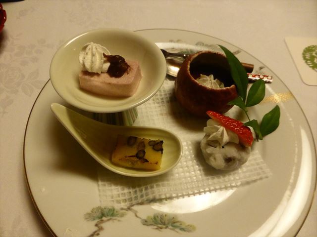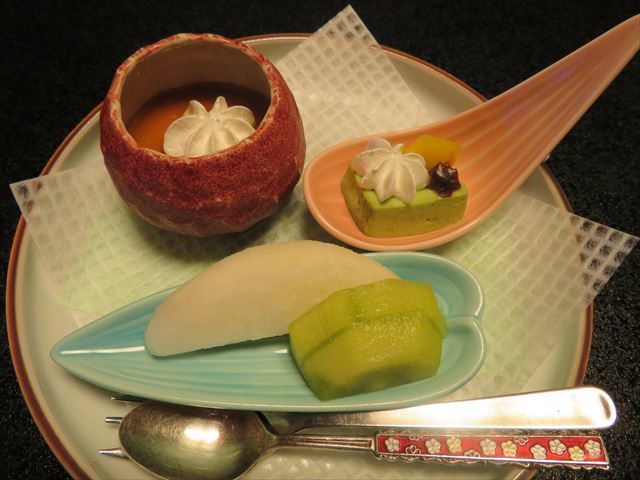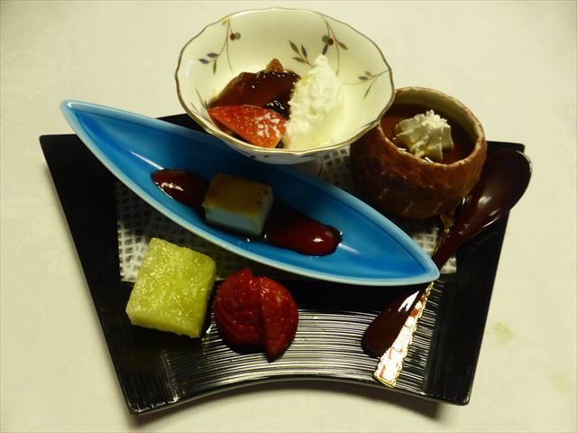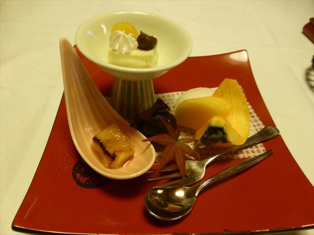 :個人的にはプリンのカラメル、百合根羊羹のラズベリーソース、ムースの黒