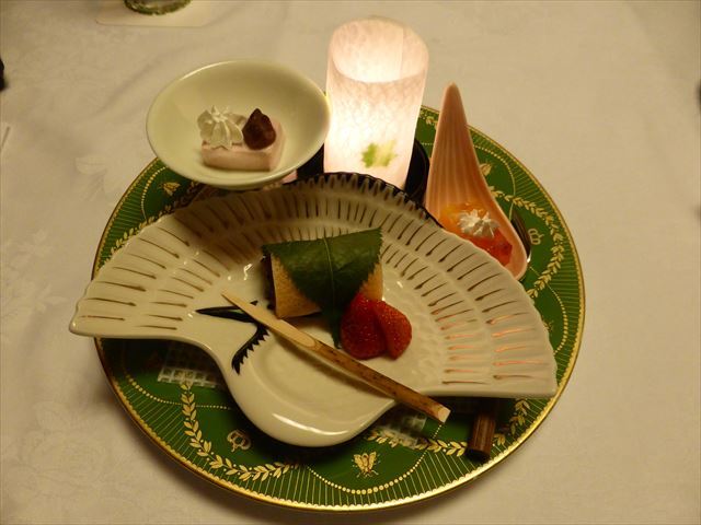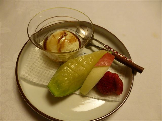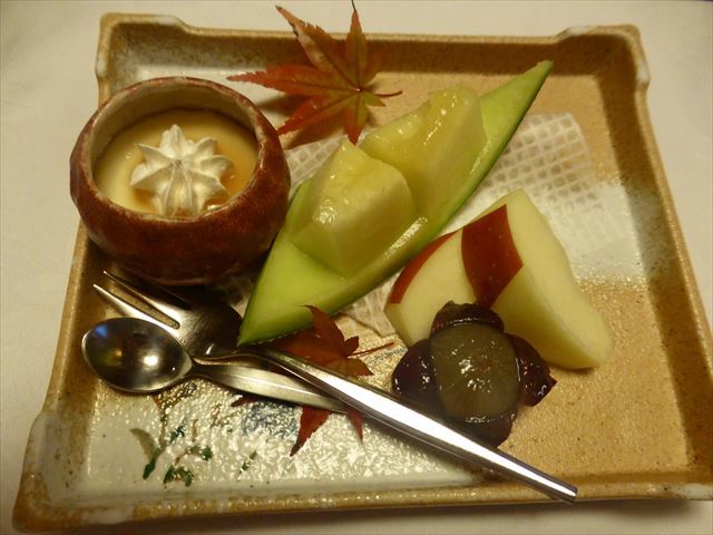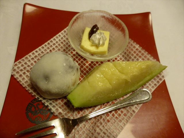 △(□) 水菓子 果物、甘味盛合せ;苺、メロン、丹那プリン、百合根羊羹・ラズベリー