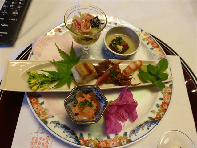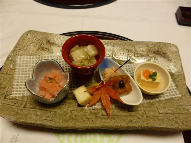 △□ 八寸 伊勢海老サラダ、二色手綱巻、紅鮭小川巻、茄子寿司、蓮根挟み揚げ、タラの芽