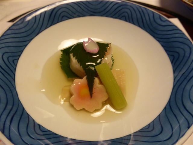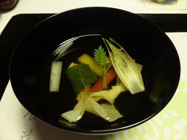 □ 御椀 車海老桜葉包、大原木野菜、結び湯葉、茗荷、木の芽