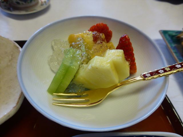 フルーツ(リンゴ、苺、パイナップル、キウイ、パパイヤ)ジュレ掛け。