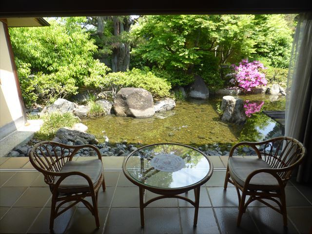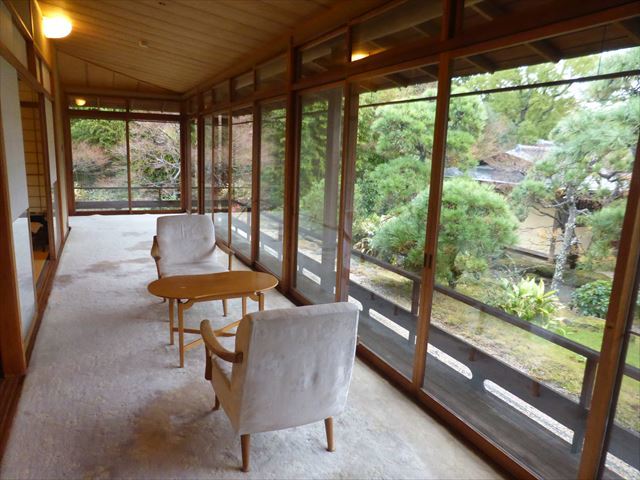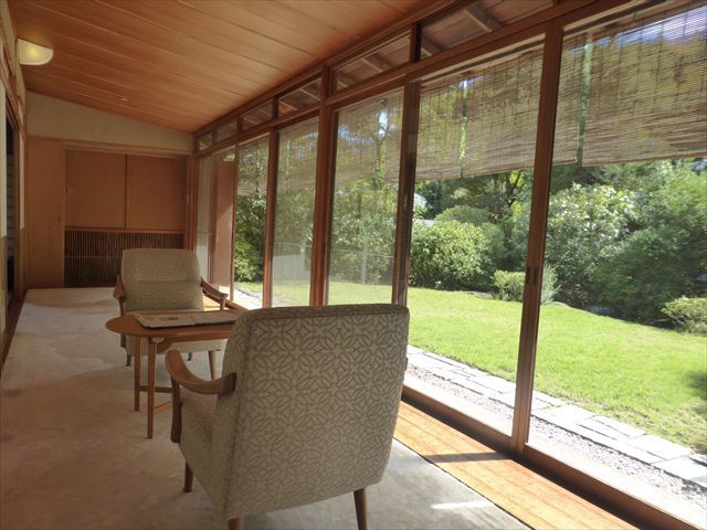 三養荘には珍しい洋風ベランダ、その外には池を伴う庭。