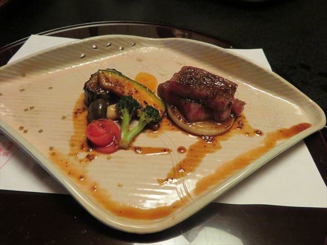 △□ 進肴 和牛サーロイン、芥子醤油焼、温野菜添え