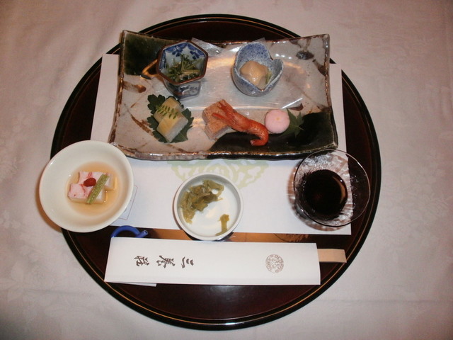 △□ 八寸 海老木の芽鮨、もずくとろろ、空豆塩煮、栄螺磯煮、小鮎山椒煮、粽麩