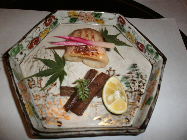 △(□) 焼物 笠子塩焼き、鰆菜種焼、隠元胡麻和え、酢橘、初神生姜