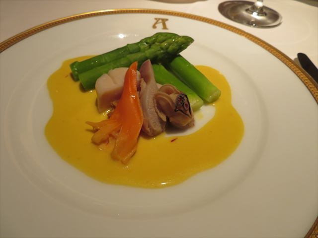 △□ 温かいグリーンアスパラガスと貝類・サフランソース(パルマ産生ハムエルダーフラワーとフルーツのジュレ との選択)