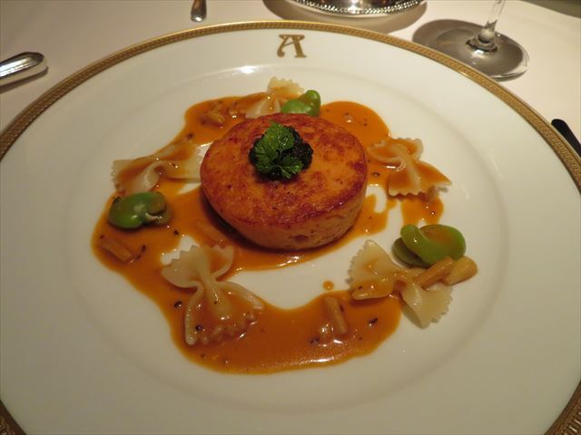 アーティチョークのピュレやフリットを添えて。フォアグラの薄切りが乗って居る。