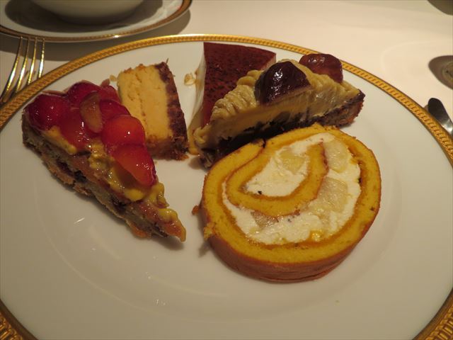 クレームブリュレ、ピーチパインのロールケーキ、栗のタルト、サクランボのタ