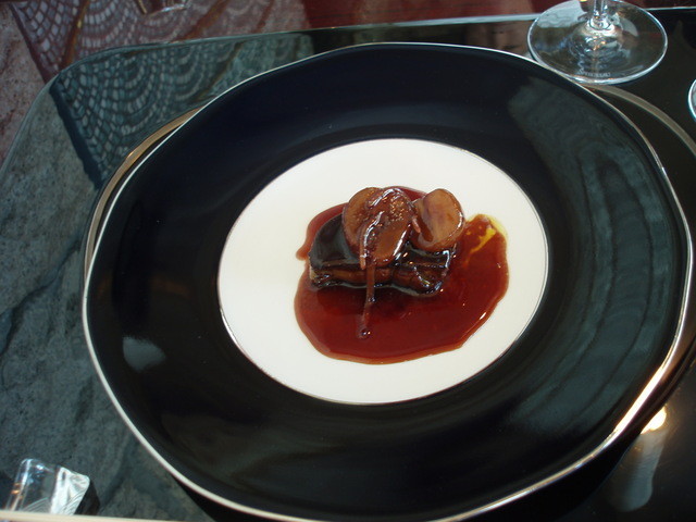 □ 鮑岩塩蒸し :黒トリュフのソース、京茄子を下に敷いて。