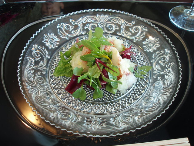 「鮑とうかい特選牛コース」で、フォアグラをオマール海老のサラダに変更して貰った。
