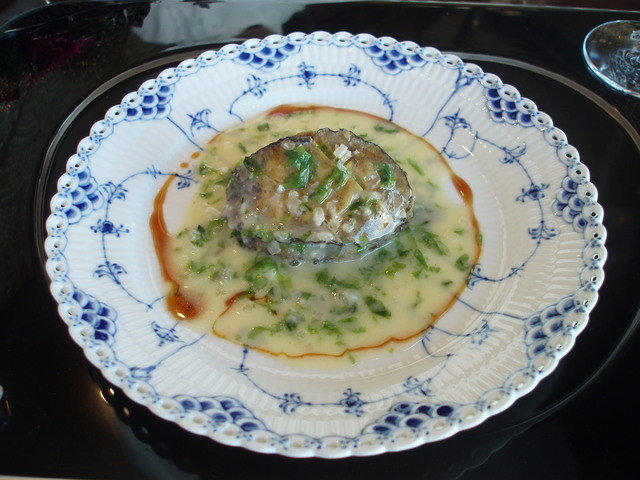 :現在は三陸の鮑。今日はバターソースに葫・エシャロット・青海苔等を加えたソース。