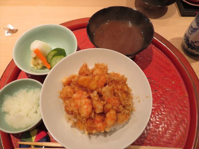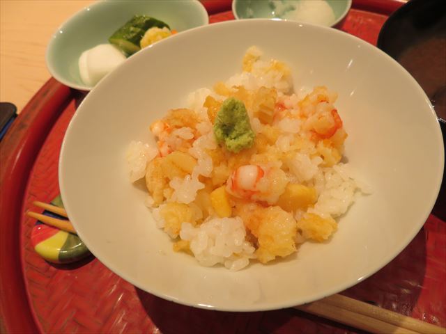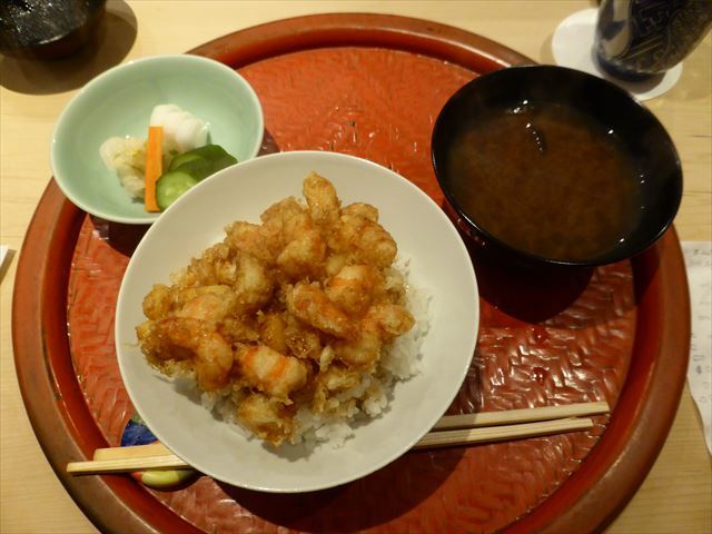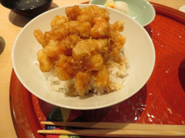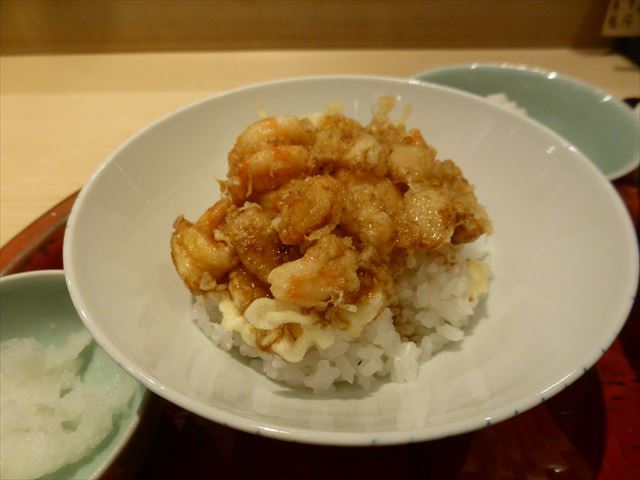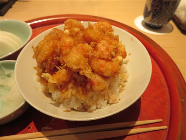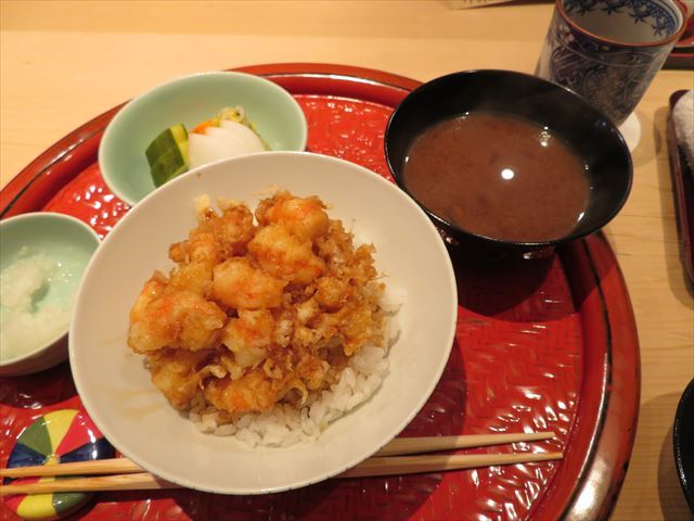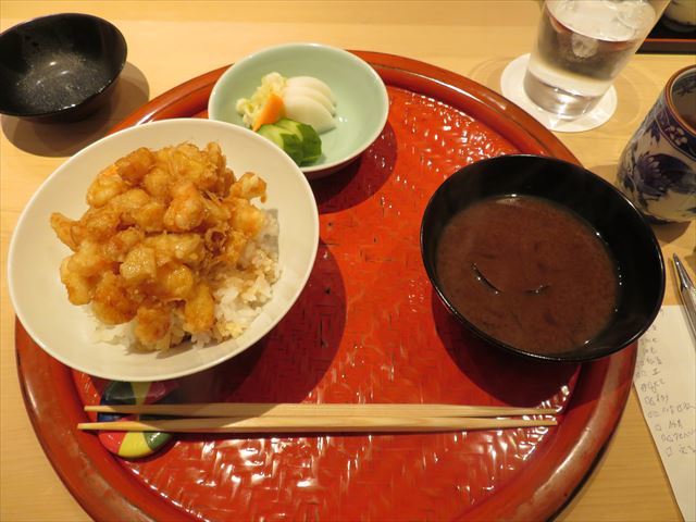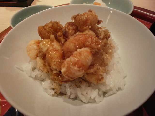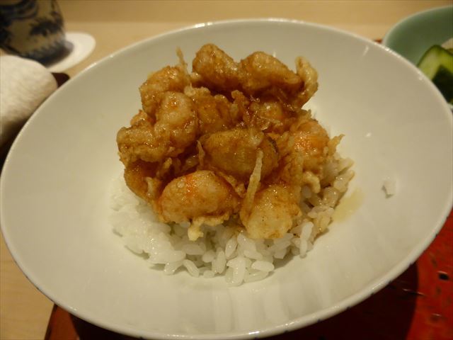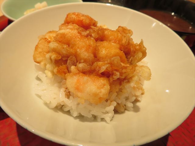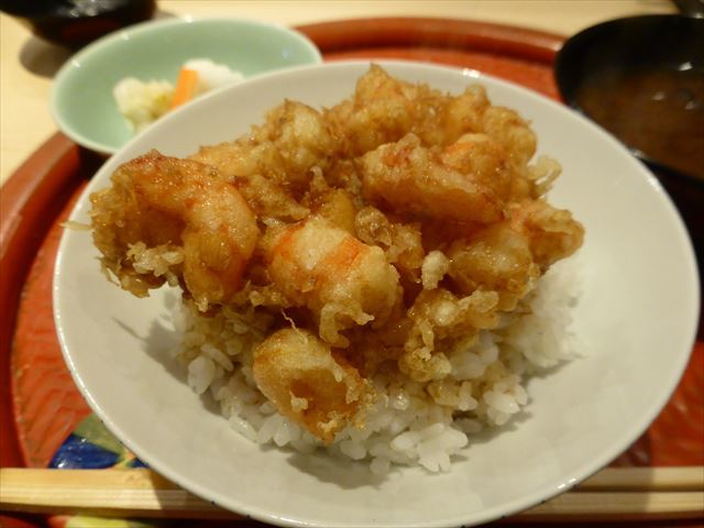 :海老主体で少し小柱が入っている。御飯の炊き具合も良い。タレの加減も良い。